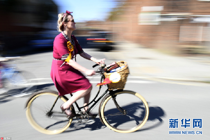 當地時間2018年5月5日,英國倫敦,當地舉辦復古騎行活動,民眾身穿花呢子服裝騎車穿行在倫敦街頭。今年是該活動舉辦十周年。(圖片來源:東方IC)