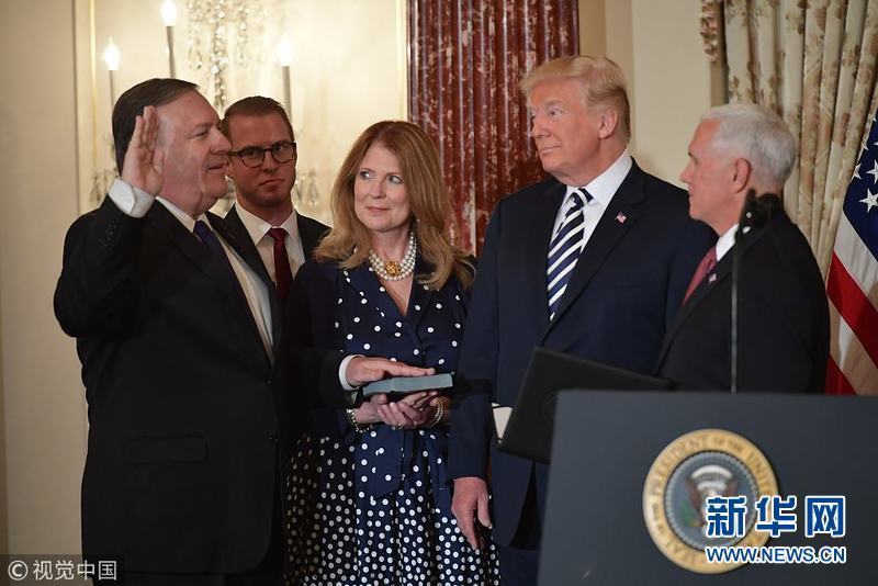 資料圖:5月2日,美國華盛頓,邁克·蓬佩奧在總統(tǒng)特朗普的見證下正式宣誓就職美國國務卿。新華網(wǎng)發(fā)