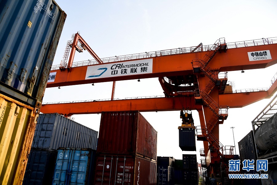 占地1800畝的中鐵聯(lián)集青島中心站內(nèi),藍(lán)色、白色的集裝箱把場(chǎng)站裝點(diǎn)成一片“集裝箱海洋”;橫穿場(chǎng)站的兩條鐵軌旁,數(shù)座巨型龍門(mén)吊繁忙作業(yè),來(lái)自海上的貨物被搬運(yùn)至將遠(yuǎn)行的國(guó)際班列上……