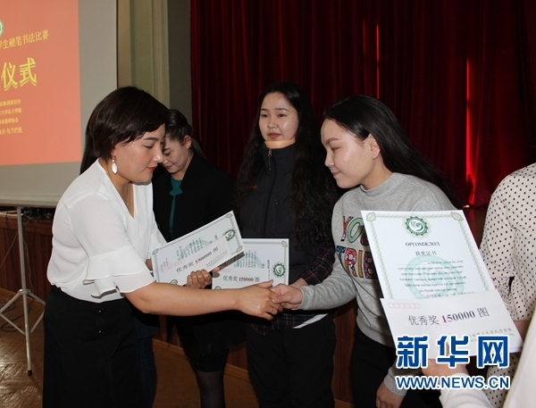 5月11日,蒙古國第六屆大中學生漢字硬筆書法比賽頒獎儀式現場。新華網發 意特格樂攝