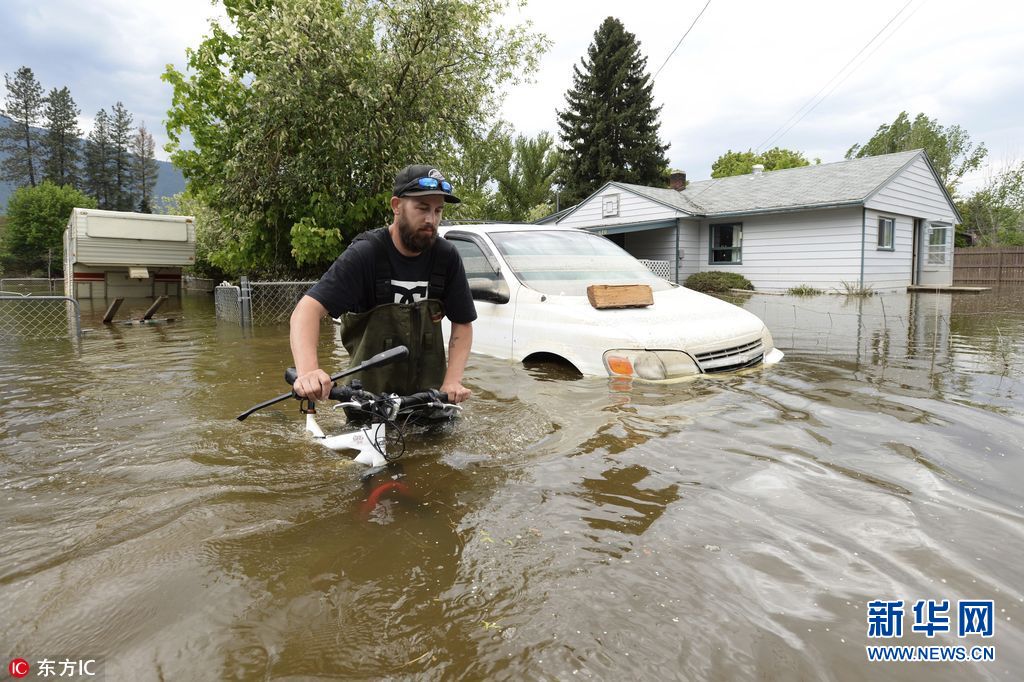 5月17日,加拿大不列顛哥倫比亞省Grand Forks,當?shù)卦夂樗u擊,房屋、車輛浸泡水中。(圖片來源:東方IC)