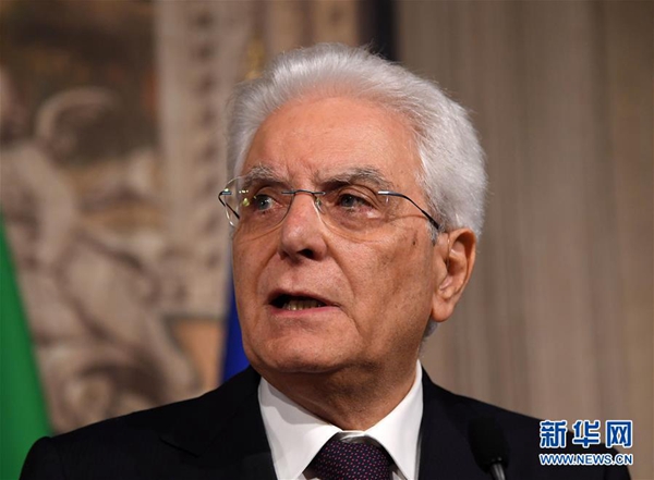 5月27日,在意大利首都羅馬,意總統馬塔雷拉出席新聞發布會。據當地媒體報道,意大利新任總理孔特27日晚間與總統馬塔雷拉會面并提交擬定的內閣成員名單時,馬塔雷拉否決了由意大利聯盟黨和五星運動力推的持疑歐立場的經濟學家保羅·薩沃納出任財政部長。孔特向總統提出放棄組閣任務請求,請求得到總統確認。新華社發(阿爾貝托·林格里亞攝)