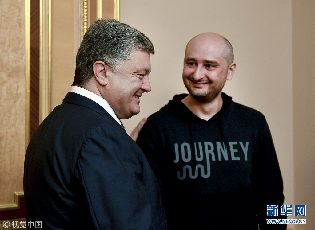 5月30日,烏克蘭基輔,烏克蘭總統波羅申科會見此前被報道“死亡”的俄羅斯記者巴布琴科。(圖片來源:視覺中國)