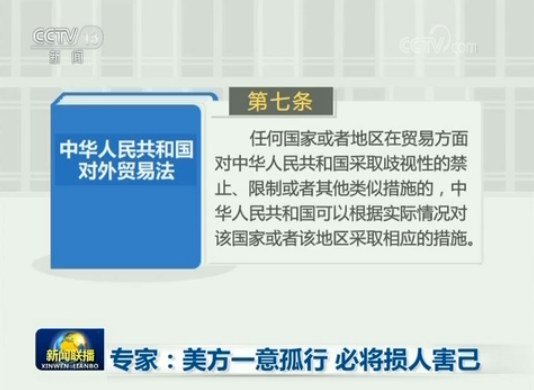 專家表示,中方采取的反制措施合理合法。根據《中華人民共和國對外貿易法》第七條,任何國家或者地區在貿易方面對中華人民共和國采取歧視性的禁止、限制或者其他類似措施的,中華人民共和國可以根據實際情況對該國家或者該地區采取相應的措施。