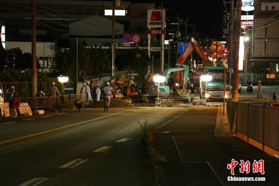 6月18日,日本大阪府發(fā)生6.1級(jí)地震。圖為位于震源附近的高槻市一處路面出現(xiàn)凹陷,相關(guān)部門正連夜進(jìn)行搶修。中新社記者 呂少威 攝