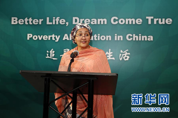 6月28日,在位于紐約的聯(lián)合國(guó)總部,聯(lián)合國(guó)常務(wù)副秘書長(zhǎng)阿明娜·穆罕默德在“追尋美好生活”中國(guó)脫貧成就展開幕式上講話。? 新華社記者李木子攝