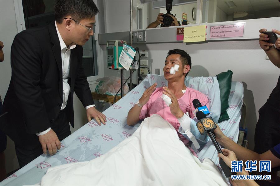 7月7日凌晨,在泰國普吉島,翻船事故幸存者黃俊雄向中國駐泰國大使呂健(左)回憶逃生經歷。新華社記者秦晴 攝