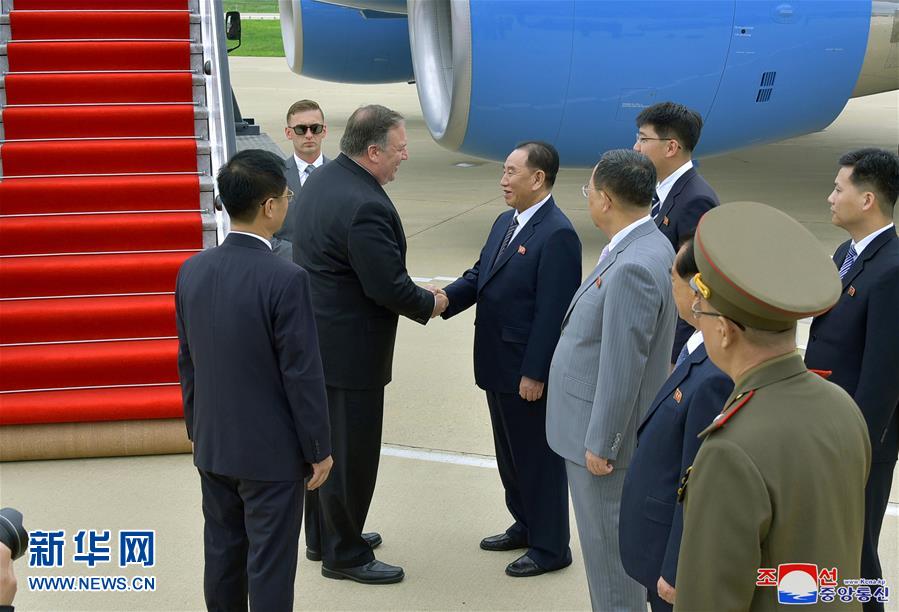 朝中社7月7日提供的照片顯示,美國國務(wù)卿蓬佩奧在朝鮮平壤與在機場迎接的朝鮮勞動黨中央委員會副委員長金英哲握手。新華社/朝中社