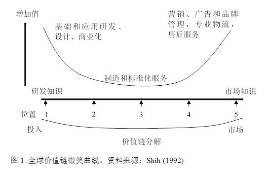 全球價值鏈構(gòu)建了一個跨國或者跨地區(qū)不同公司實現(xiàn)不同的工序和商業(yè)功能的生產(chǎn)架構(gòu)(Grossman和Rossi-Hansberg,2012)。這個架構(gòu)是“生產(chǎn)性的(價值增長的)通向并且支持最終使用的順序” (Sturgeon 2001)。微笑曲線提出了一種不同的解構(gòu)國際貿(mào)易的方法。有些國家專業(yè)化“生產(chǎn)”知識與研發(fā),而另一些國家專業(yè)化于制造業(yè),或者品牌營銷。因此,一個產(chǎn)品的增加值不再是完全屬于某一個國家,而是整條價值鏈上的參與者都可以分一杯羹。在為最終產(chǎn)品貢獻價值的生產(chǎn)工序的鏈條上(既,產(chǎn)品的價值鏈),一般的工序鏈條開始于基礎和應用研究與設計。這些研究與設計活動往往會帶來新的想法、技術、新產(chǎn)品設計和新的生產(chǎn)工藝。這個工序鏈條下一環(huán)節(jié)是商業(yè)化這些研究成果,如專利和知識產(chǎn)權(quán)(想法、論文、知識等);再下一環(huán)節(jié)是資源的獲取和材料的生產(chǎn)(包括農(nóng)業(yè)產(chǎn)品),零部件的生產(chǎn)和產(chǎn)品的組裝,以及最后環(huán)節(jié)的營銷、廣告、品牌管理、物流、商業(yè)服務和售后服務。另外,價值鏈在文獻中的定義是超出中間品貿(mào)易的,它強調(diào)在不同環(huán)節(jié)上領先企業(yè)與供應商之間的權(quán)力架構(gòu) (Milberg,2004)。