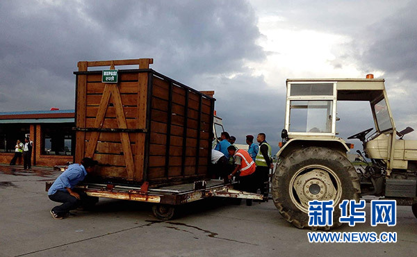 7月12日,在尼泊爾首都加德滿都特里布萬國際機場,工作人員在運送裝有犀牛的木箱。新華社發(fā)