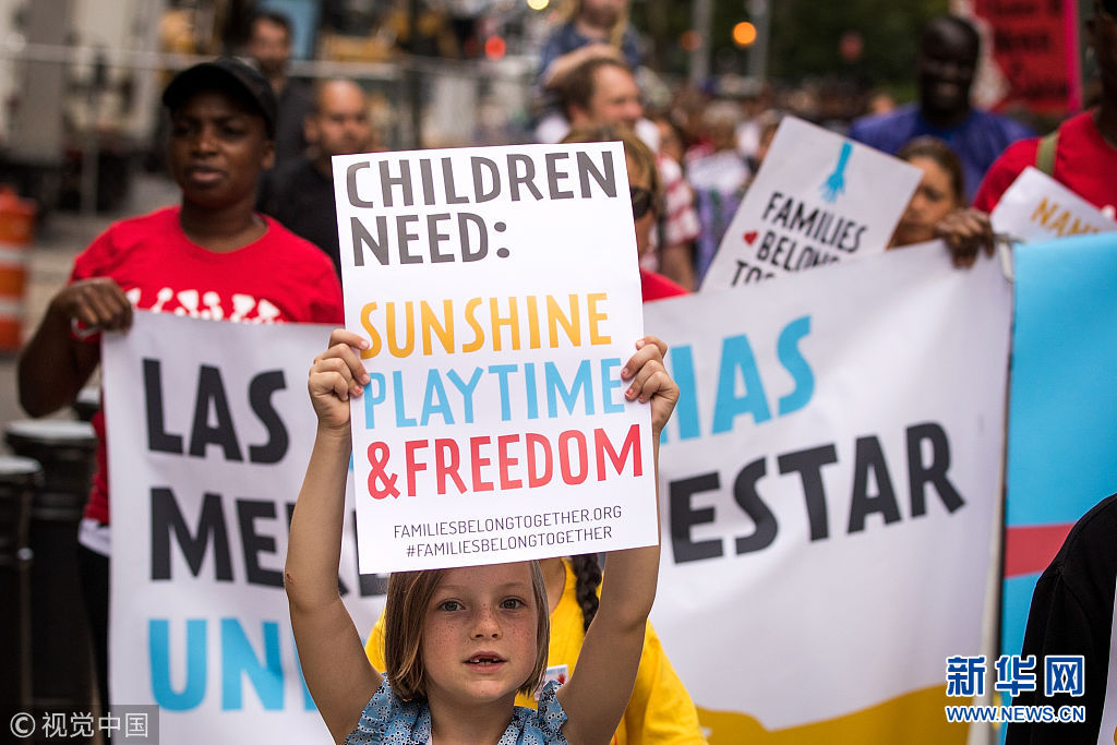 當(dāng)?shù)貢r間2018年7月18日,美國紐約,包括托兒所從業(yè)人員、父母及其子女在內(nèi)的社會各界人士在美國移民和海關(guān)執(zhí)法局(ICE)附近組織示威游行,抗議特朗普政府近期在美國南部邊境實施針對非法移民家庭的強制拘留和家庭成員離散政策。 當(dāng)天,共和黨領(lǐng)導(dǎo)的眾議院通過了支持ICE的決議,并譴責(zé)一些民主黨人和進步積極分子要求廢除ICE的呼聲。(圖片來源:視覺中國)