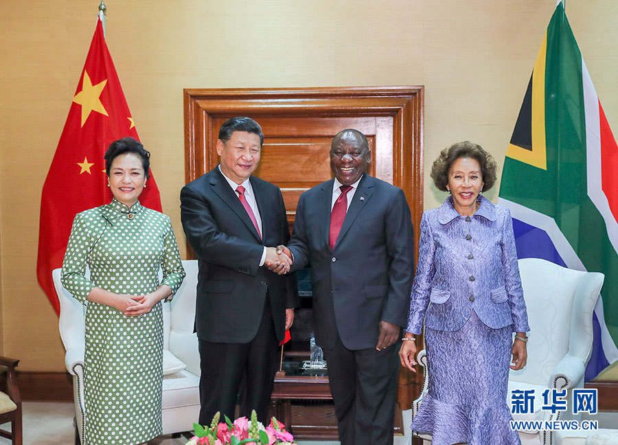 總統府前廣場,微風拂面,陽光和煦。中南兩國國旗迎風飄揚。習近平和夫人彭麗媛受到拉馬福薩和夫人莫采佩熱情迎接。兩國元首夫婦登上檢閱臺。儀仗隊行持槍禮。軍樂隊奏中國國歌。現場鳴放21響禮炮。習近平檢閱儀仗隊。軍樂隊奏南非國歌。習近平和彭麗媛同南方主要官員握手。拉馬福薩夫婦同中方陪同人員握手。兩國元首夫婦親切寒暄。拉馬福薩對習近平在南中建交20周年之際訪問南非并出席金磚國家領導人會晤表示熱烈歡迎。