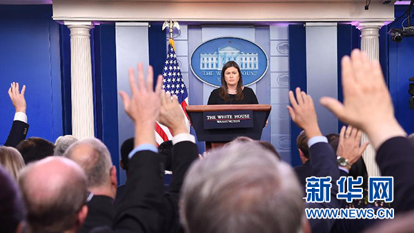8月2日,在美國首都華盛頓,白宮發言人桑德斯出席記者會。新華社記者劉杰攝