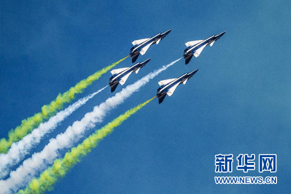 蔚藍的天空下,八一飛行表演隊成功上演了六機向下開花、五機水平向上開花、四機編隊橫滾、單機蛇行扭轉等21個高難度飛行動作,贏得了現場觀眾陣陣掌聲。