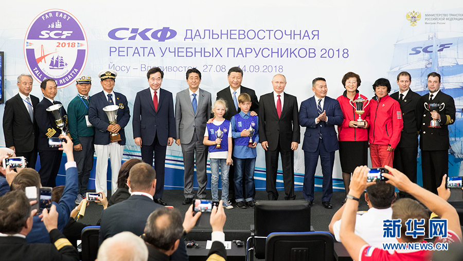 9月12日,第四屆東方經(jīng)濟論壇全會在符拉迪沃斯托克舉行。中國國家主席習近平、俄羅斯總統(tǒng)普京、蒙古國總統(tǒng)巴特圖勒嘎、日本首相安倍晉三、韓國總理李洛淵等出席。這是全會后,與會各國領導人共同出席第三屆“遠東杯”國際帆船拉力賽第一賽段頒獎儀式。 新華社記者黃敬文攝