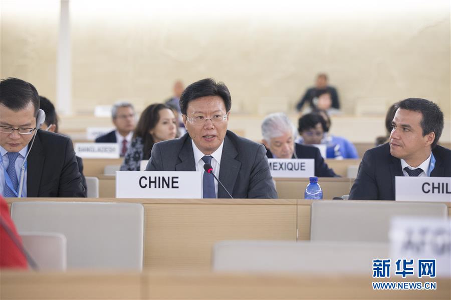 9月14日,在瑞士日內瓦,中國常駐聯合國日內瓦辦事處和瑞士其他國際組織代表俞建華(中)在會上發表聯合聲明。當日,聯合國人權理事會第39次會議在日內瓦萬國宮開幕。中國代表近140個國家呼吁攜手合作消除貧困、更好促進和保護人權,表達了廣大發展中國家的心聲,得到發展中國家熱烈響應。新華社記者徐金泉攝