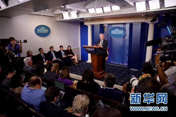 10月3日,在美國首都華盛頓,美國總統國家安全事務助理博爾頓出席記者會。 新華社發(沈霆攝)