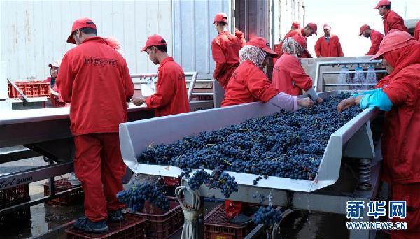 10月1日,在摩洛哥小鎮魯馬尼,紅農場酒莊的工作人員對收獲的葡萄進行清洗加工。 據紅農場總經理馬蒙·薩耶介紹,該酒莊正在擴大產能,希望通過參加首屆中國國際進口博覽會,將摩洛哥葡萄酒引進中國市場。首屆中國國際進口博覽會將于11月5日至10日在上海舉行。目前已有130多個國家和地區的2800多家企業確認參展。 新華社記者陳斌杰攝