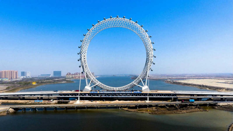 “渤海之眼”摩天輪由一個(gè)外層外形支承桁架組成。這個(gè)環(huán)形架由4600噸鋼梁建成,花兩年時(shí)間建造。有別于傳統(tǒng)的有軸摩天輪,渤海之眼摩天輪中間沒(méi)有任何支撐,運(yùn)行時(shí)輪盤(pán)不轉(zhuǎn)動(dòng),轎廂自帶行走機(jī)構(gòu),通過(guò)軌道沿輪盤(pán)轉(zhuǎn)動(dòng)。
