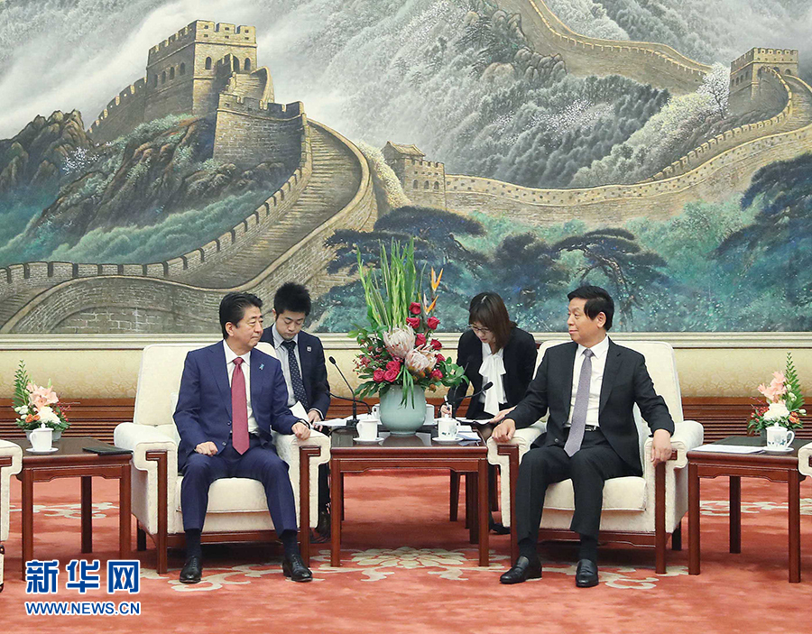 10月26日,全國人大常委會委員長栗戰書在北京人民大會堂會見日本首相安倍晉三。 新華社記者劉衛兵攝