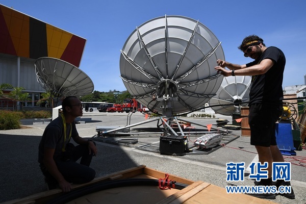 11月13日,工作人員在巴布亞新幾內(nèi)亞首都莫爾茲比港的APEC國際媒體中心安裝衛(wèi)星設(shè)備。 新華社記者呂小煒攝