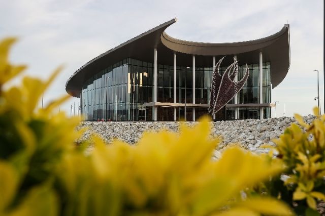 APEC大廈坐落于海濱,是此次APEC會議場館之一。主建筑造型像是巴新土著居民特有的傳統木舟。昔日,土著居民正是駕著這種木舟乘風破浪,開啟周邊貿易。正門前,12米高的金屬雕塑像木舟極具辨識度的雙帆,又形似巴新國鳥天堂鳥雙翼展向空中,澳大利亞設計師以此寓意“為開啟繁榮貿易之旅揚帆”。