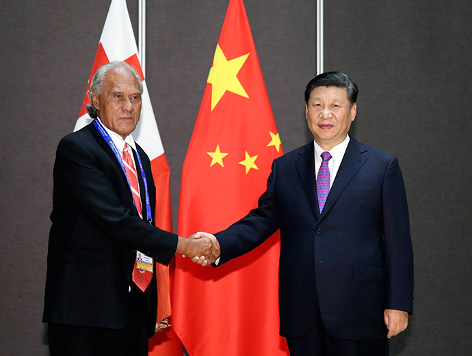 11月16日,國家主席習近平在莫爾茲比港分別會見建交太平洋島國領導人。這是習近平會見湯加首相波希瓦。新華社記者 丁林 攝