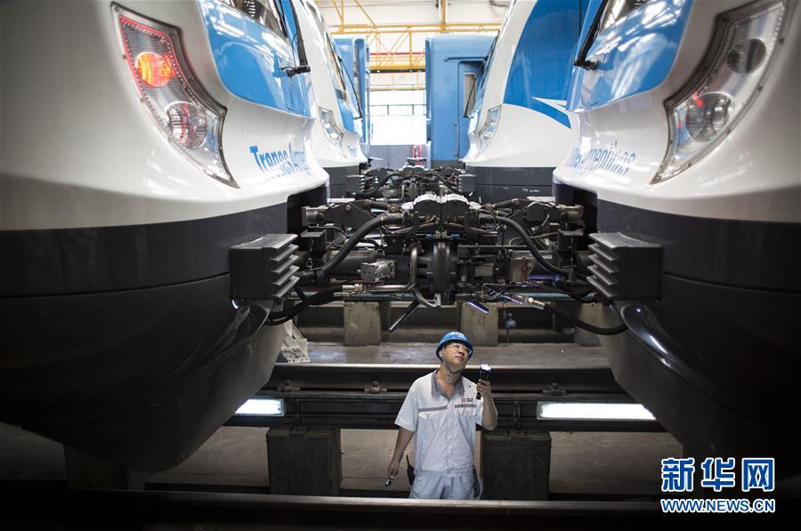 2017年4月11日,在位于阿根廷首都布宜諾斯艾利斯以南的利亞瓦略爾,中方技術(shù)人員檢查為羅卡線城際鐵路提供的列車(chē)。近年來(lái),在阿根廷,中車(chē)制造的各種軌距、各種制式、各種型號(hào)的鐵路機(jī)車(chē)、動(dòng)車(chē)組、客車(chē)、貨車(chē)和地鐵列車(chē)密集交付。新華社發(fā)(馬丁·薩巴拉 攝)