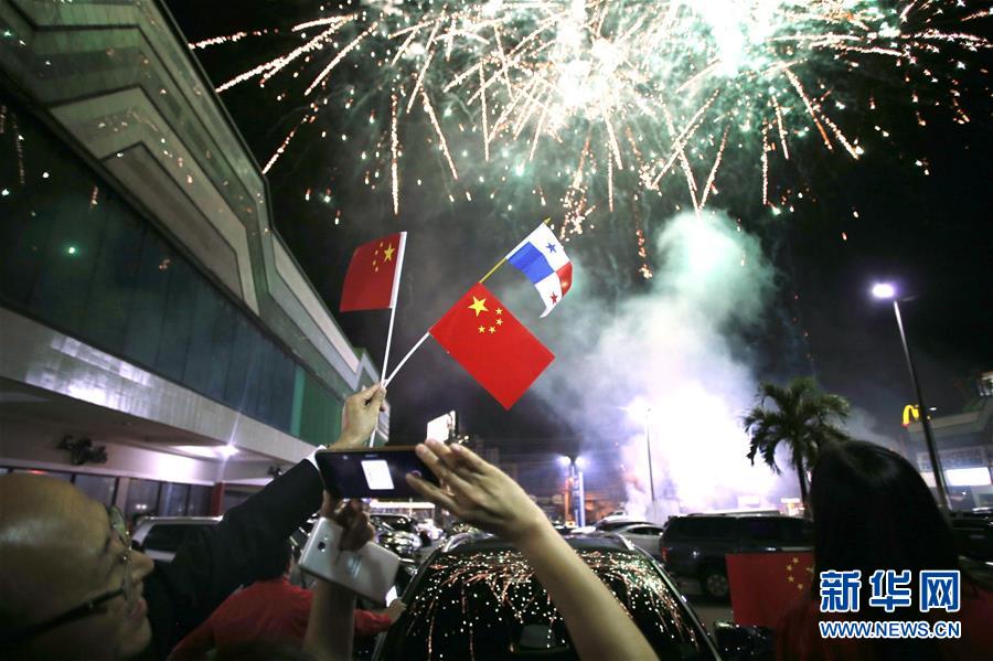 2017年6月12日,在巴拿馬首都巴拿馬城的華人社區(qū),人們?cè)诎湍民R與中國(guó)建交的慶祝活動(dòng)上拍攝煙花。新華社發(fā)(毛里西奧·巴倫蘇埃拉 攝)