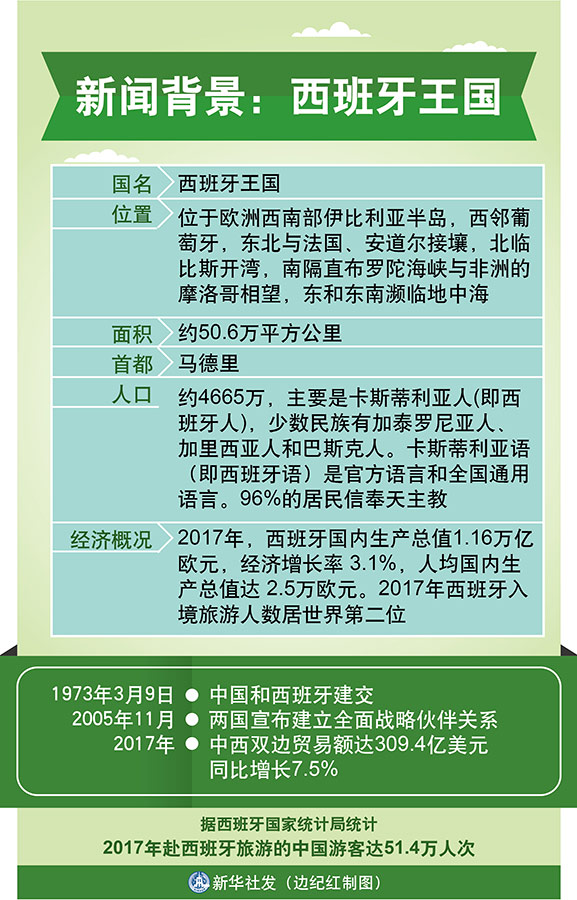 近年來,中西經貿合作持續(xù)發(fā)展。西班牙是中國在歐盟內第六大貿易伙伴,中國是西班牙在歐盟外第一大貿易伙伴。2017年,雙邊貿易額達309.4億美元,同比增長7.5%。據西班牙國家統計局統計,2017年赴西班牙旅游的中國游客達51.4萬人次。