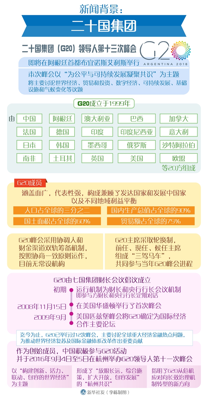 二十國集團(tuán)(G20)領(lǐng)導(dǎo)人第十三次峰會即將在阿根廷首都布宜諾斯艾利斯舉行。本次峰會以“為公平與可持續(xù)發(fā)展凝聚共識”為主題,將主要討論世界經(jīng)濟(jì)、貿(mào)易和投資、數(shù)字經(jīng)濟(jì)、可持續(xù)發(fā)展、基礎(chǔ)設(shè)施和氣候變化等議題。