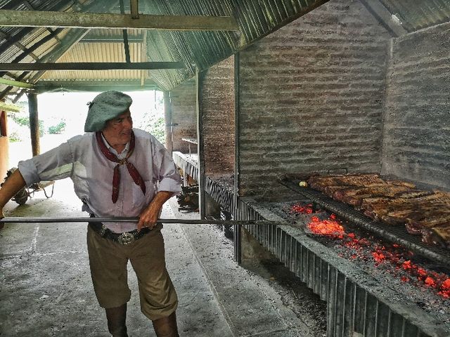 在布宜諾斯艾利斯市郊的圣·蘇珊娜農場,男主人在為客人制作傳統阿根廷烤肉。(新華社記者王曄攝)