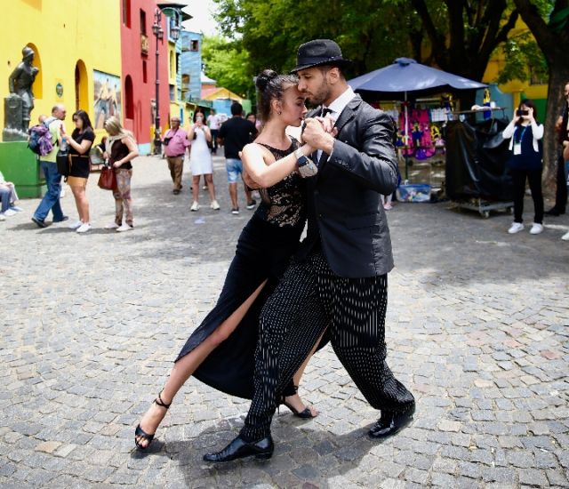 在布宜諾斯艾利斯市博卡區,一對舞者當街跳起探戈。(新華社記者姚大偉攝)