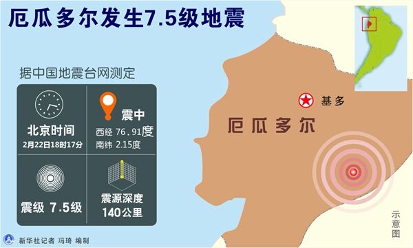 新華社基多2月22日電(記者郝云甫)厄瓜多爾中南部地區22日發生7.5級地震,首都基多、第一大城市瓜亞基爾及多個省份均有震感。目前尚無人員傷亡和財產損失報告。