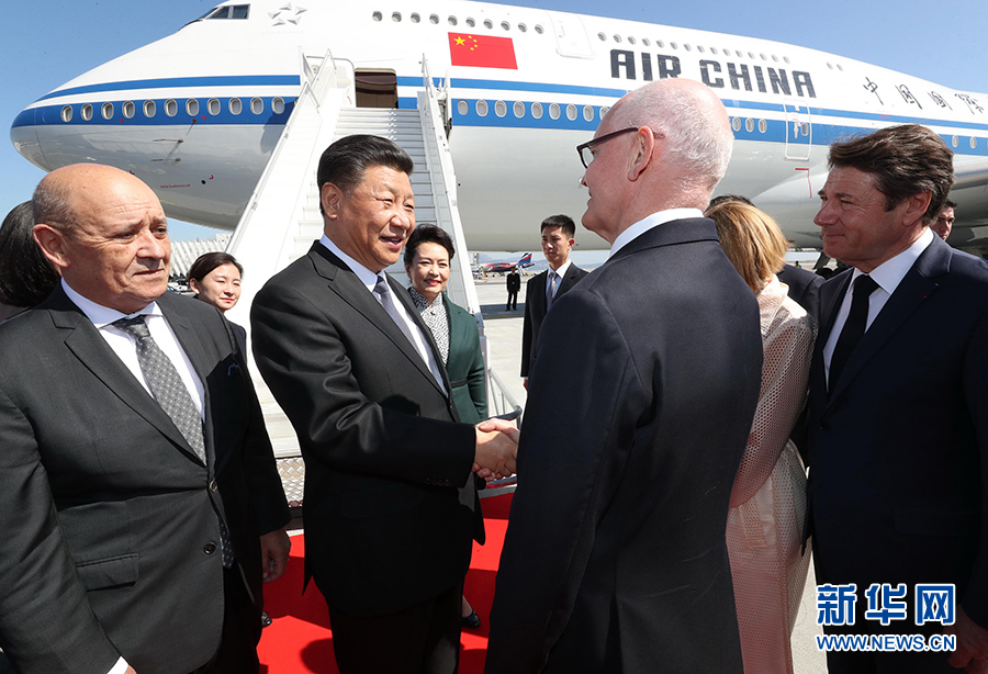 當地時間中午12時許,習近平乘坐的專機抵達尼斯機場。習近平和夫人彭麗媛受到摩納哥政府首腦、國務大臣泰爾,摩納哥對外關系與合作大臣托內利熱情迎接。法國外長勒德里昂也到機場迎接。習近平和彭麗媛沿紅地毯前行,禮兵分列紅地毯兩側,行注目禮。