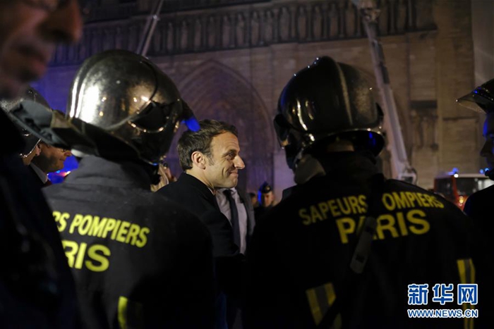 4月15日,在法國巴黎,法國總統馬克龍(中)在火災現場視察。新華社發(亞歷山大·卡曼 攝)