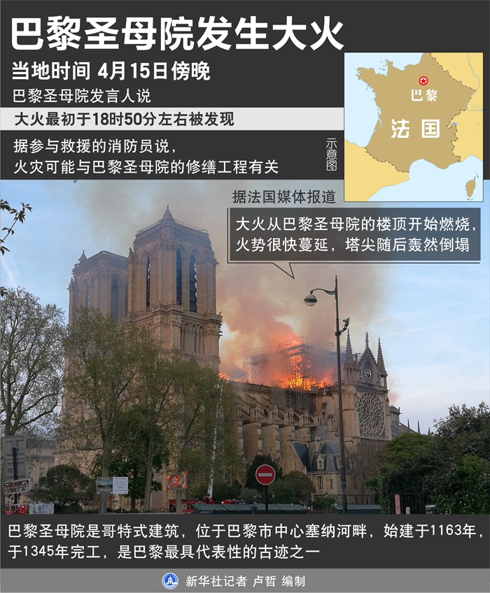 法國總統馬克龍當晚在火災現場說,巴黎圣母院“代表著我們的歷史、我們的文學和我們的想象力”,重建巴黎圣母院是法國人民的期待,也是“我們的歷史使命”。(參與記者:應強、徐詠春、唐霽、陳晨)