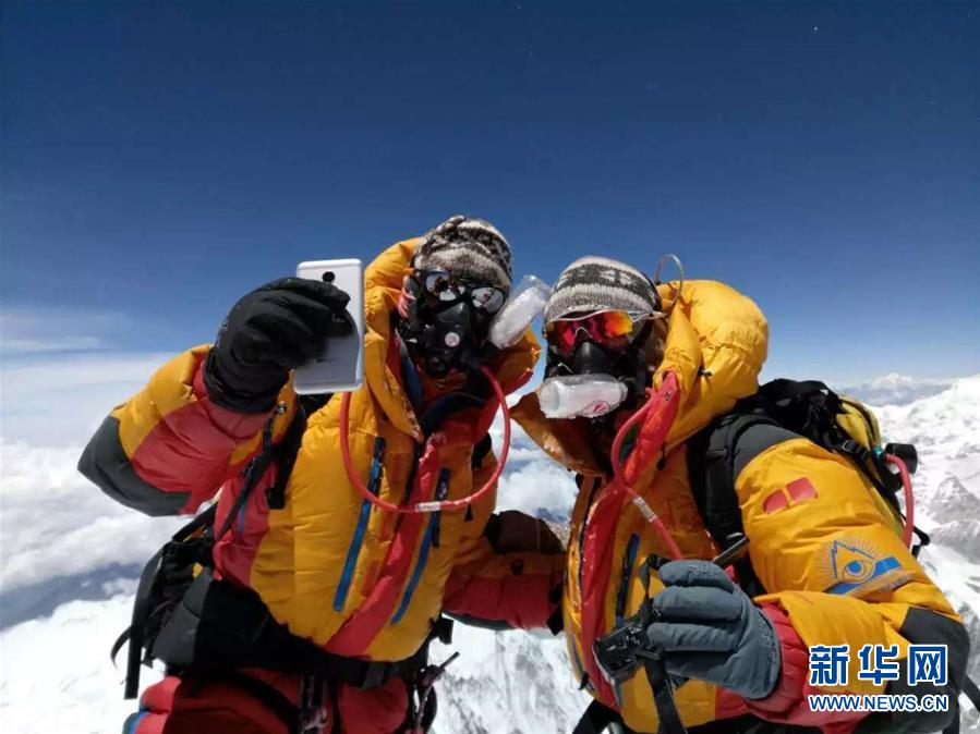 2016年,登山向導索朗次仁(右)第一次登頂珠峰,在峰頂與同伴合影留念(資料照片)。新華社發