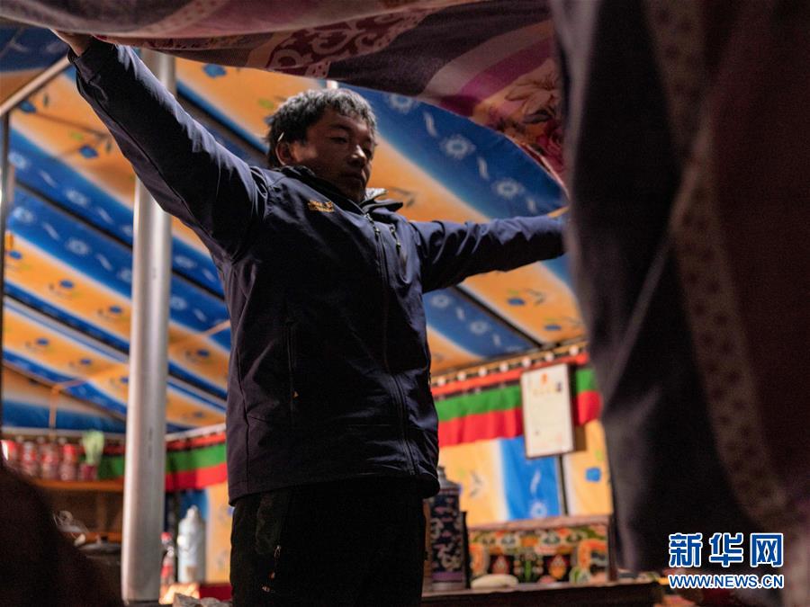 益格在整理帳篷旅館的床鋪(4月28日攝)。新華社發(孫非 攝)