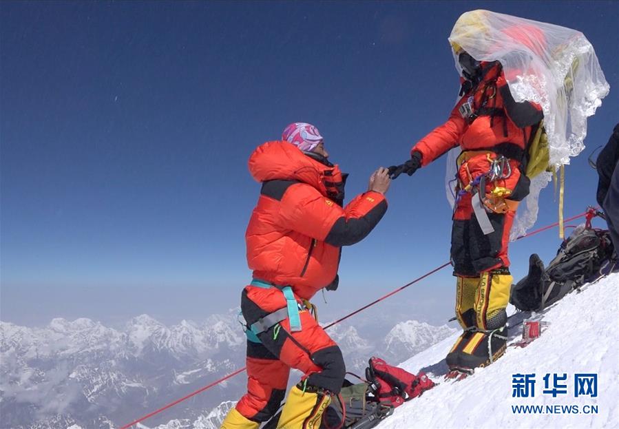 珠穆朗瑪峰頂,王銀龍向關嫻求婚(2018年5月16日攝)。新華社發