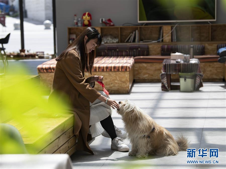 關嫻在拉薩自己開的客棧里與寵物互動(4月10日攝)。新華社發(孫非 攝)