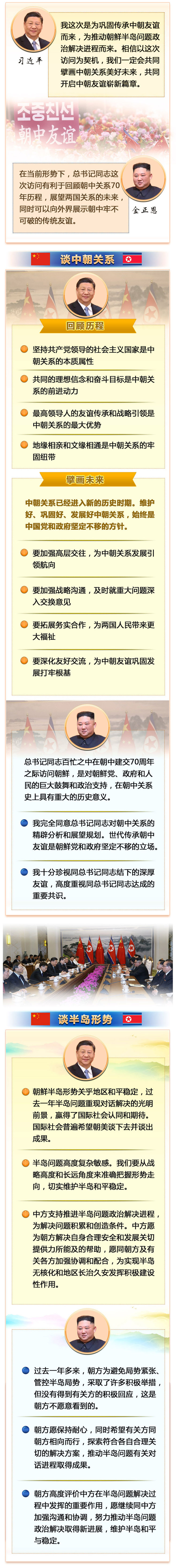 金正恩說,我代表朝鮮黨、政府和人民,熱烈歡迎習近平總書記對朝鮮進行國事訪問??倳浲景倜χ性诔薪ń?0周年之際訪問朝鮮,是對朝鮮黨、政府和人民的巨大鼓舞和政治支持,在朝中關系史上具有重大的歷史意義。今天平壤有25萬多民眾涌上街頭,熱烈歡迎總書記同志。在當前形勢下,總書記同志這次訪問有利于回顧朝中關系70年歷程,展望兩國關系的未來,同時可以向外界展示朝中牢不可破的傳統友誼。我完全同意總書記同志對朝中關系的精辟分析和展望規劃。世代傳承朝中友誼是朝鮮黨和政府堅定不移的立場。我十分珍視同總書記同志結下的深厚友誼,高度重視同總書記同志達成的重要共識,愿以總書記同志這次訪朝為契機,推動朝中雙方進一步加強戰略溝通,深化各領域友好交往,把朝中關系不斷提升至新的高度。