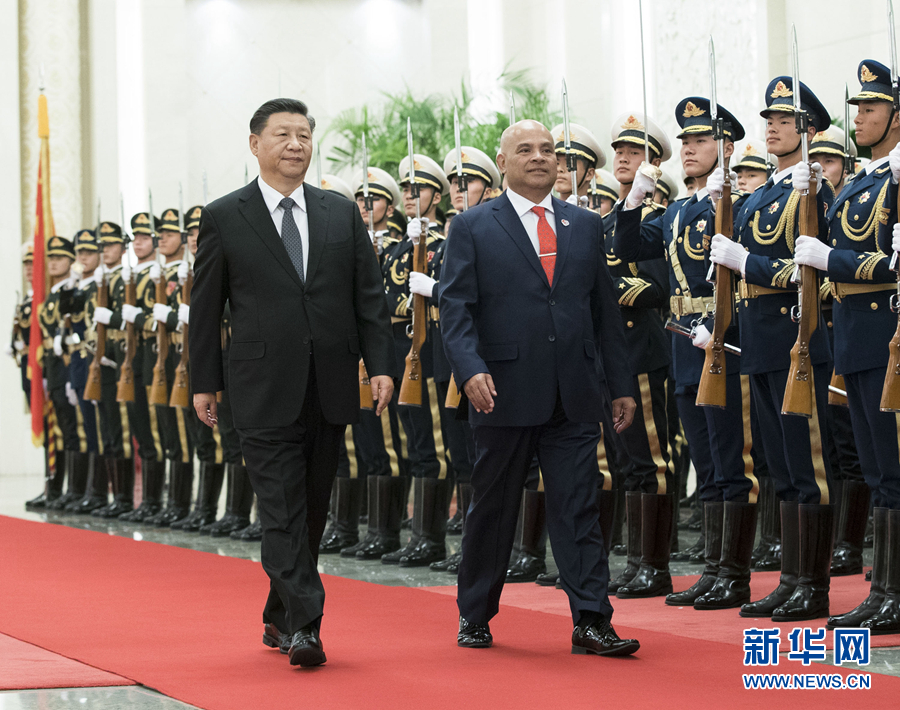 12月13日,國家主席習近平在北京人民大會堂同密克羅尼西亞聯邦總統帕努埃洛會談。這是會談前,習近平在人民大會堂北大廳為帕努埃洛舉行歡迎儀式。 新華社記者 申宏 攝