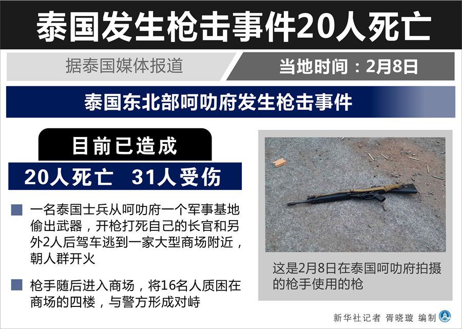 新華社曼谷2月8日電(記者汪瑾 任芊)據泰國媒體報道,泰國東北部呵叻府8日發生槍擊事件,目前已造成20人死亡、31人受傷。泰國特種部隊進入槍手藏身的商場,商場內大批民眾被疏散,但槍手目前所處位置尚不清楚。