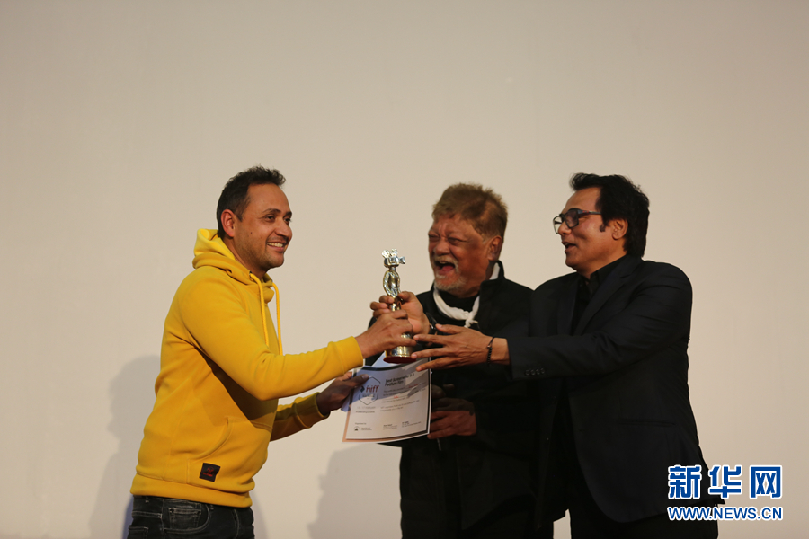 2月17日,第三屆尼泊爾國際電影節的閉幕儀式在加德滿都市政大廳內舉行,資深電影人士正在給獲獎者(左)頒獎。本屆電影節2月13日開始,一共有來自40個國家和地區的80部影片入選,其中中國和哈薩克斯坦聯合拍攝的《音樂家》作為開幕電影,備受關注。記者 唐薇 攝?