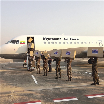 2月25日清晨迎著朝陽,緬甸國防軍使用空軍飛機運送N95級別口罩、護目鏡、防護服等醫療捐助物資前往中國,旨在幫助中國抗擊新冠肺炎疫情,緬甸國防軍總參謀長妙通烏上將、駐緬甸大使陳海、使館武官熊韶煒等在內比都機場送行。光明日報駐仰光記者鹿鋮攝/光明圖片