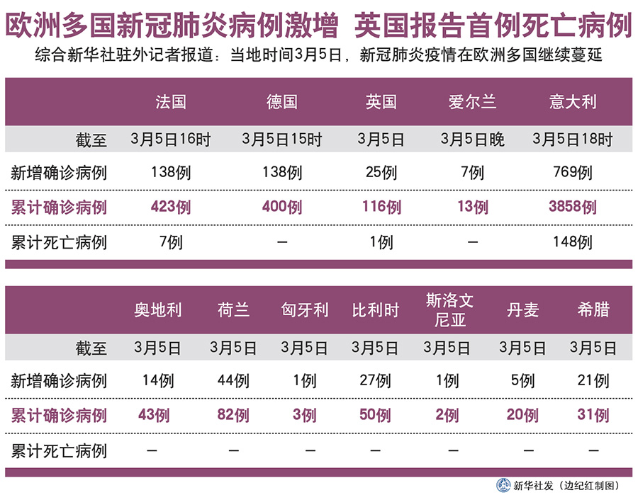 綜合消息:歐洲多國新冠肺炎病例激增 英國報告首例死亡病例-新華網