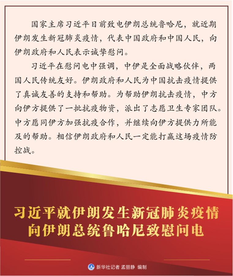 習近平在慰問電中強調,中伊是全面戰略伙伴,兩國人民傳統友好。伊朗政府和人民為中國抗擊疫情提供了真誠友善的支持和幫助。為幫助伊朗抗擊疫情,中方向伊方提供了一批抗疫物資,派出了志愿衛生專家團隊。中方愿同伊方加強抗疫合作,并繼續向伊方提供力所能及的幫助。相信伊朗政府和人民一定能打贏這場疫情防控戰。
