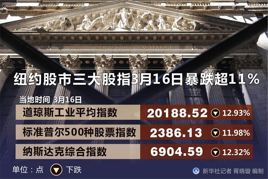 16日,紐約股市開盤暴跌,并再次觸發7%的熔斷點,交易重啟后跌幅擴大。截至收盤,道瓊斯工業平均指數下跌2997.10點,跌幅為12.93%;標準普爾500種股票指數下跌324.89點,跌幅為11.98%;納斯達克綜合指數則下跌了970.28點,跌幅為12.32%。