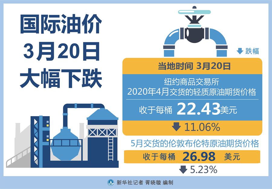 截至當天收盤,紐約商品交易所4月交貨的輕質(zhì)原油期貨價格下跌2.79美元,收于每桶22.43美元,跌幅為11.06%。5月交貨的倫敦布倫特原油期貨價格下跌1.49美元,收于每桶26.98美元,跌幅為5.23%。